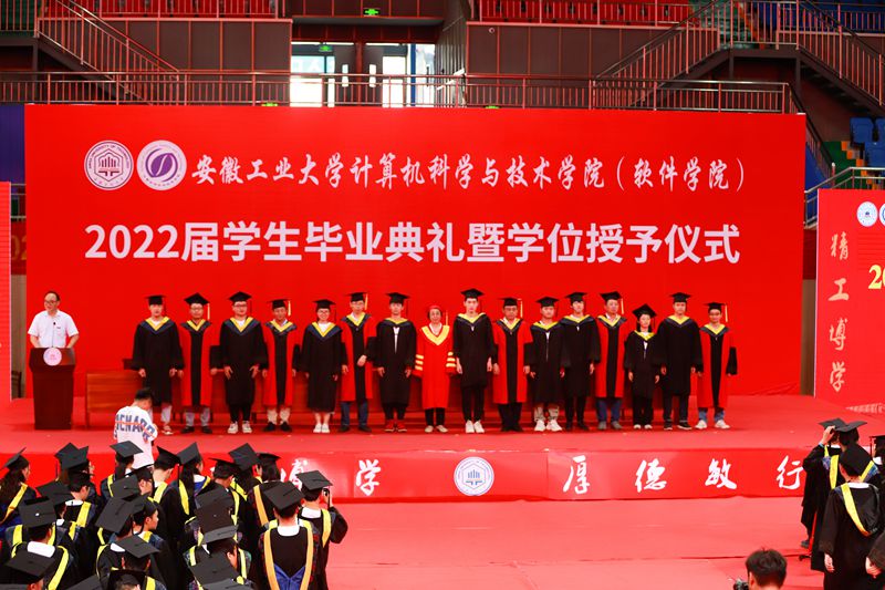 学位授予仪式上,领导老师为2022届职工、研究生和本科毕业生扶苏正冠,并合影留念。