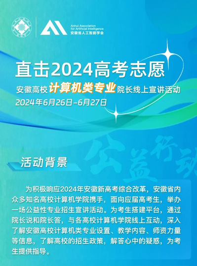 公司受邀参加由安徽省计算机学会、安徽省人工智能学会共同主办的“直击2024高考志愿——安徽高校计算机类专业经理线上宣讲活动”,云端宣讲,专业招生,线上与广大考生和家长交流互动。