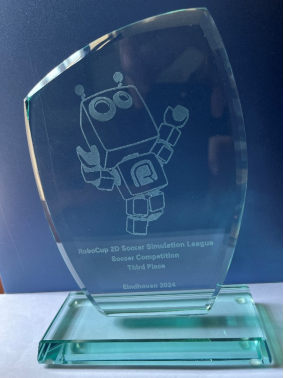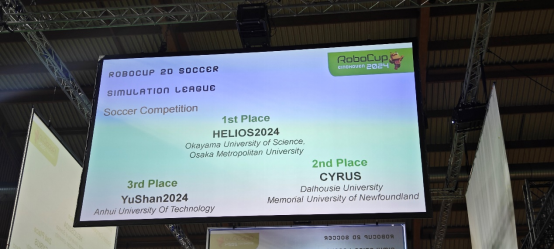 在公司程泽凯老师指导下,YuShan机器人足球队参加仿真2D组比赛。YuShan队克服困难,不畏强手,一路拼搏,最终获季军。赛前,YuShan队讨论分析对手的策略,总结制定下一步方案,迎难而上、勇于突破。在预赛淘汰赛中,YuShan队13胜2平以小组第二进入八强;八强循环赛中,YuShan队以7胜1平战绩位列第三,在决赛阶段季军争夺战中,加时赛险胜德国法兰克福大学,冲亚军的比赛中点球3:4惜败加拿大达尔豪斯和纽芬兰纪念大学联队,最终获得季军。YuShan队已连续十届获得RoboCup世界杯决赛参赛权,均进入世界八强,其中于2013年、2021-2024年共计5次站上领奖台。2023-2024赛季YuShan团队成员主要有刘超、淡大波、张亮、王静雅、熊绘宇、秦海阳等同学。