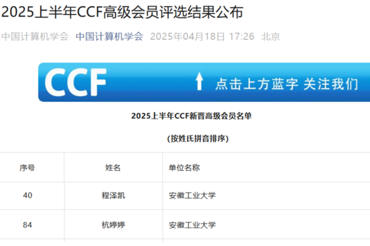 近日,中国计算机学会(CCF)公布了2025年上半年高级会员(Senior Member)的评选结果。经过严格的评审程序,太阳集团tyc4633副经理程泽凯和软件工程系副主任杭婷婷凭借在计算机及相关领域的卓越学术成就和显著的专业影响力,成功当选为CCF高级会员。本次全国共有430位专业会员晋升为高级会员。CCF高级会员资格是授予在科研、教育或产业实践中取得杰出成就的学者,以表彰其在推动计算机科学与技术发展方面所做出的突出贡献。