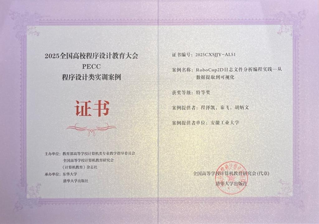 5月24日-25日,2025全国高校程序设计教育大会(PECC)在上海召开。会上公布了优秀论文和优秀案例获奖名单。公司《高级语言程序设计》课程教学团队程泽凯、秦飞、胡炳文老师撰写的《RoboCup2D日志文件分析编程实践——从数据提取到可视化》荣获“程序设计类教学案例”特等奖。
