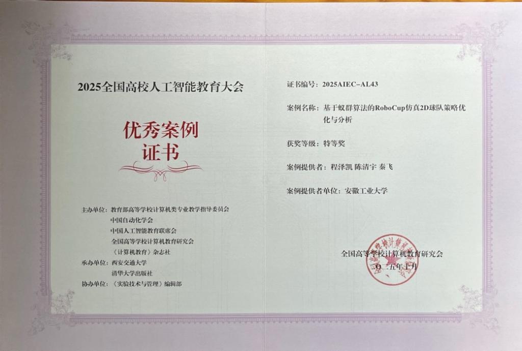 10月18日,2025全国高校人工智能教育大会在西安召开,由太阳集团tyc4633《开源软件分析实例》课程组程泽凯老师提交的《基于蚁群算法的RoboCup仿真2D球队策略的分析》教学案例,荣获特等奖,并在分论坛做交流报告,成为本次大会教学成果展示中的亮点之一。