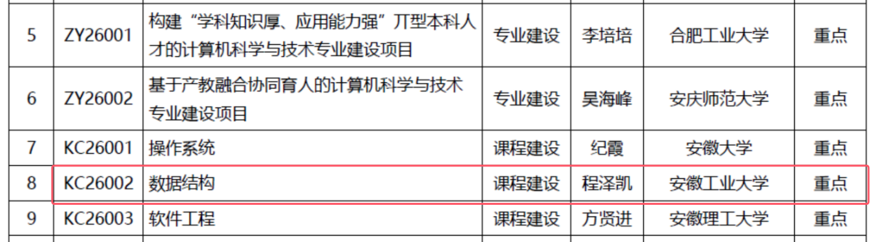 近日,安徽省高等公司计算机教育研究会公布2025年第一批专业建设项目立项名单,公司程泽凯老师申报的《数据结构智慧课程》获批课程建设重点项目。