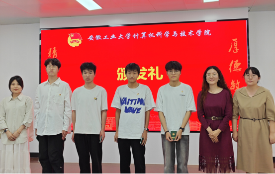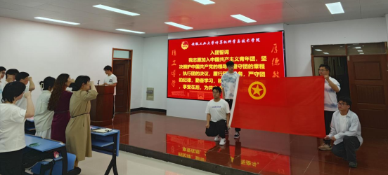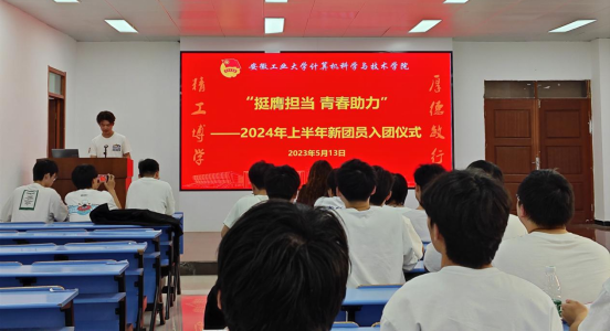 在庄严嘹亮的国歌声中,入团仪式正式拉开序幕。林颖为新团员讲解入团意义并宣读新团员名单,与会老师逐一为新团员颁发团徽徽章和团员证。随后智能Y221班王宇驰带领全体新发展团员举起右拳,面向团旗庄严宣誓,铿锵有力、刻骨铭心的誓言,表达了团员们对共青团组织的无限向往和追求。新团员代表——计223班孙立文发言,将以实际行动践行团员的责任和义务,坚定理想信念、学先锋榜样、向优秀看齐。西部计划优秀志愿者硕计231班张春云,以自己的亲身经历践行团员誓言,积极响应团组织的号召,勇于担当,敢于创新,用青春和热情,到基层、到西部、到祖国最需要的地方绽放光彩。校青马工程培训班优秀学员——智能Y221班丁鹏领学了习近平总书记五四寄语精神,号召新老共青团员要深入学习贯彻习近平总书记关于青年工作的重要思想,牢记习近平总书记对于青年一代健康成长、建功立业提出的希望要求,用实际行动证明自己无愧于“共青团员”这个光荣的称号。