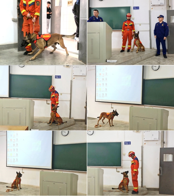 秦兰星为同学们讲解了警犬搜救的一些理论知识。他提到,警犬之所以能在搜救工作中发挥重要作用,主要得益于它们极其敏锐的嗅觉,而且警犬经过专业训练,对于不同的指令有着精准的理解和执行能力,这使得它们可以快速、准确地在特定区域内展开搜救行动。随后训练有素的警犬在秦班长的带领下进入教室,伴随着一声声清晰有力的指令,警犬迅速准确地做出坐、卧、立、跑等动作,展现出极高的专业素养。搜救犬的精彩表现赢得了现场同学们的阵阵掌声,也让大家对消防救援中的特殊力量有了更深刻的认识。智能242班尚培宇同学说:“这次讲座不仅是知识的传递,更是一次警醒。而且学到的这些逃生和扑救知识十分实用,说不定哪天就能救自己和他人一命。”