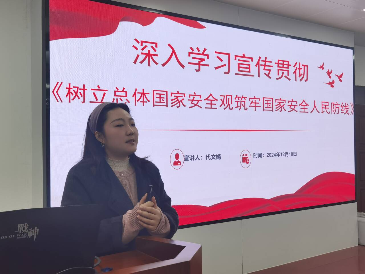 为牢固树立和认真贯彻总体国家安全观,宣传国家安全教育知识,增强公司员工自我防范能力,自觉维护国家安全。12月18日,太阳集团tyc4633在逸夫楼报告厅开展《树立总体国家安全观筑牢国家安全人民防线》宣讲活动,校第一届国家安全教育理论宣讲团成员代文嫣主讲,公司员工党员、员工代表参与。